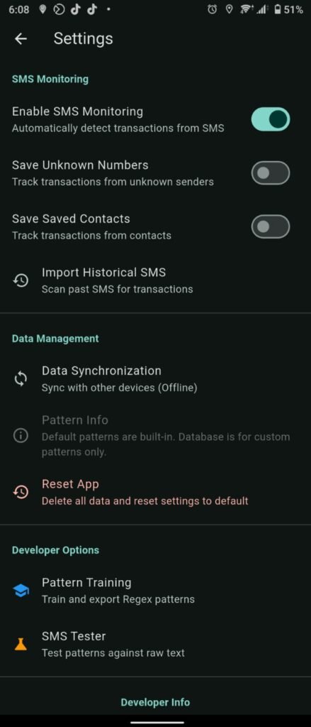 - Pattern Learning System: Teach the app to recognize new SMS formats without waiting for app updates