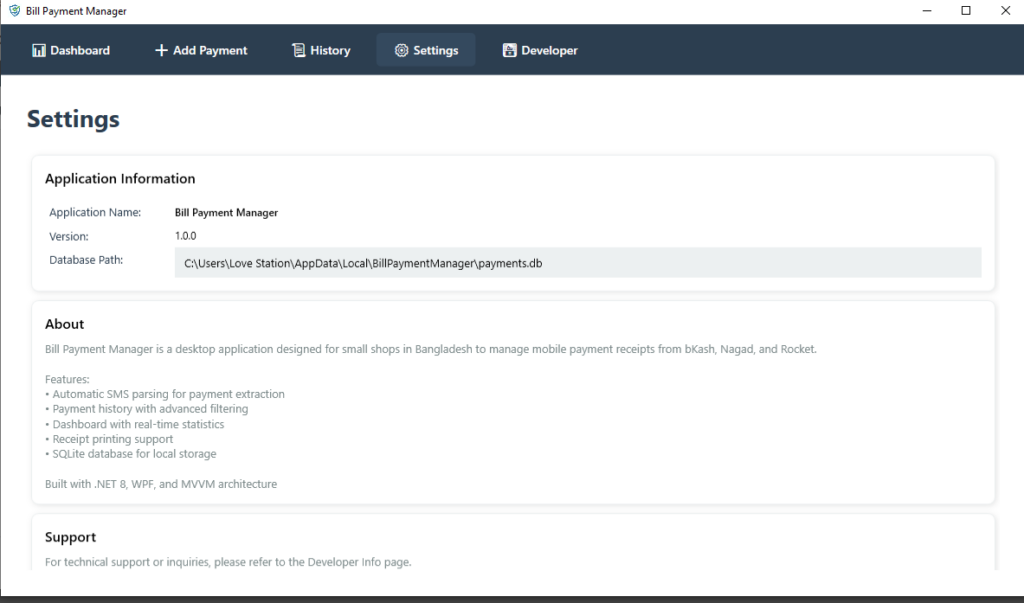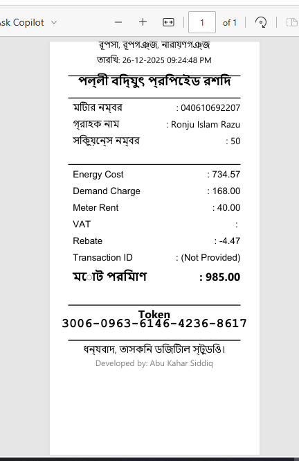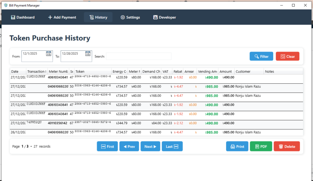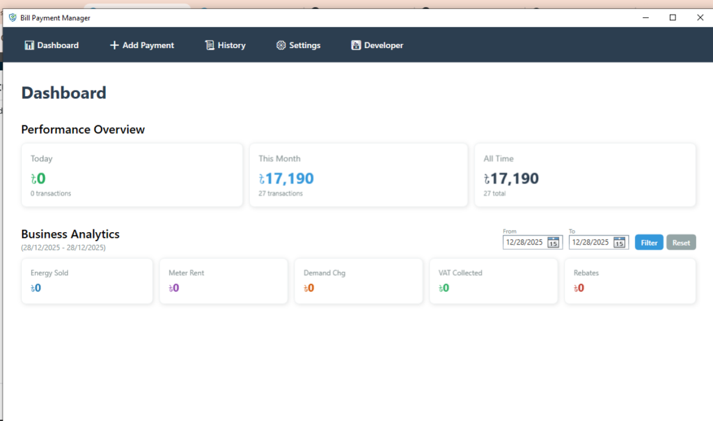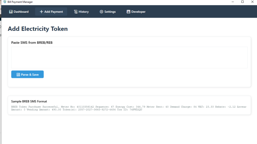 Bill Payment Manager automates the process of selling electricity tokens. It parses transaction SMS messages to extract critical data (Token, Meter Info, Cost Breakdown), saves the records to a local database, and generates professional thermal receipts. It also features a powerful dashboard for financial analytics.